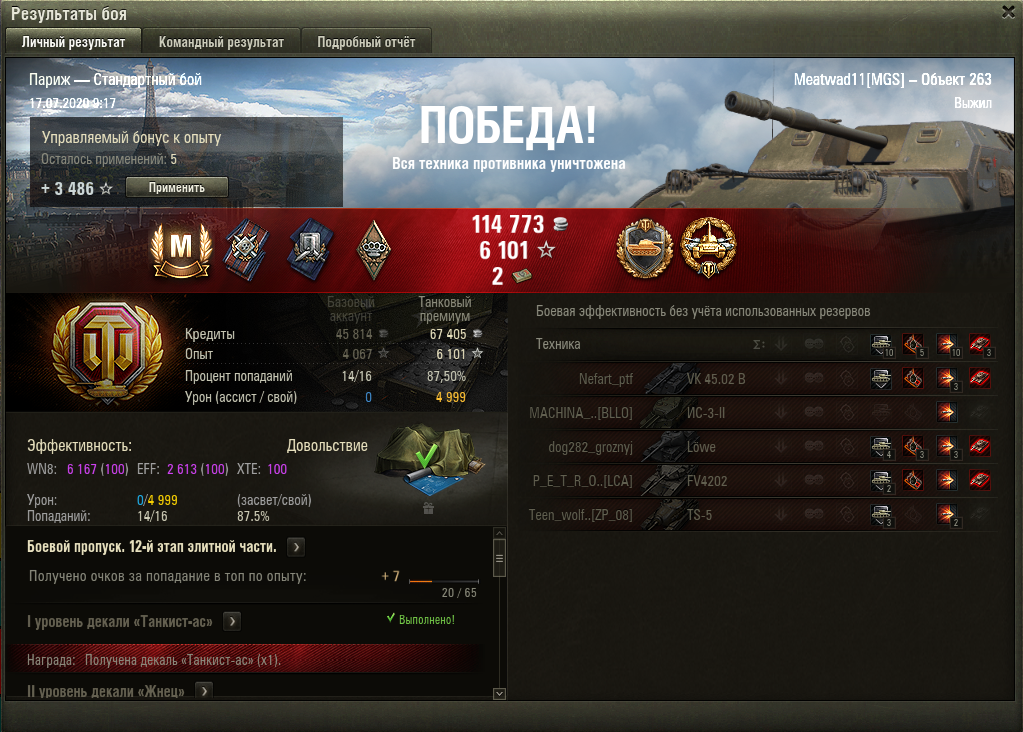 В итоге урвал сразу мастера с копеечнешим перевесом. Планка стоит 1159 - набрал 1162!! Обычно всегда 30-ти опыта не хватает, как на зло или что-то подобного)) Стоял вверху ямы на раше, спрятав нлд, расстреливал беспомощных 8-к, единственно против которых этот танк чего-то может... Дико пригорело бы, если не взял, т.к. один шот мог ещё дать, но не срослось...