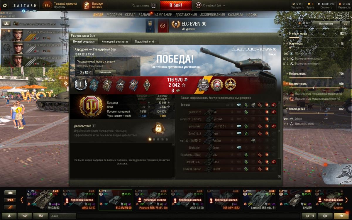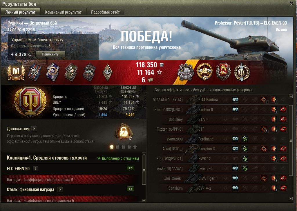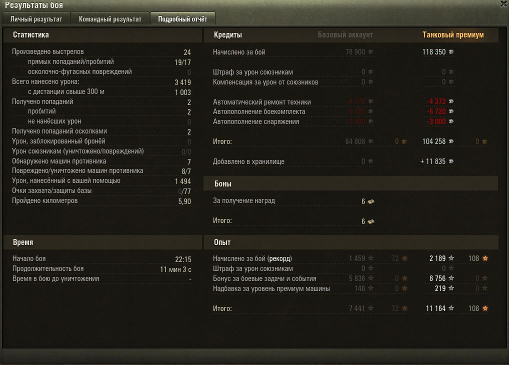 Первые 10 боёв ещё держался со средушкой 340, а потом сорвался в тыщ-пыщ-ололо. В итоге сессия слабо отличается от моих обычных чисел. Играл чуть аккуратнее, настрелял чуть меньше, насветил чуть больше. Но - и только. Полноценно упороться не получилось. Ладно, может, завтра ещё попробую.