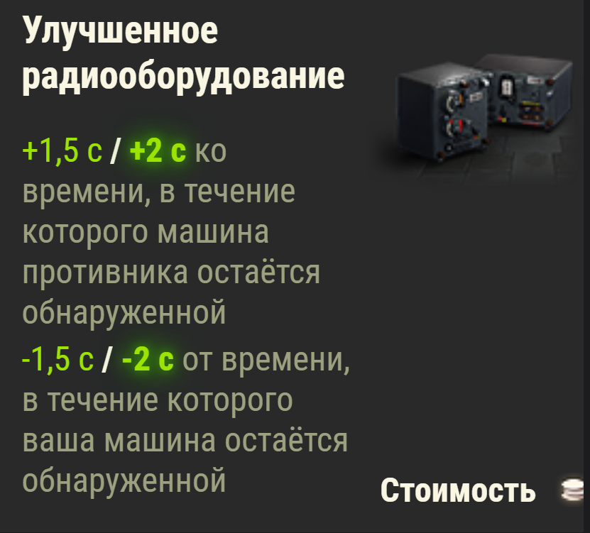 +2 секунды от времени когда машина противника остается обнаруженной? Так у тебя кд 27 секунд и зачем тебе это? Похоже это бесполезное оборудование для елки? Или ошибаюсь?