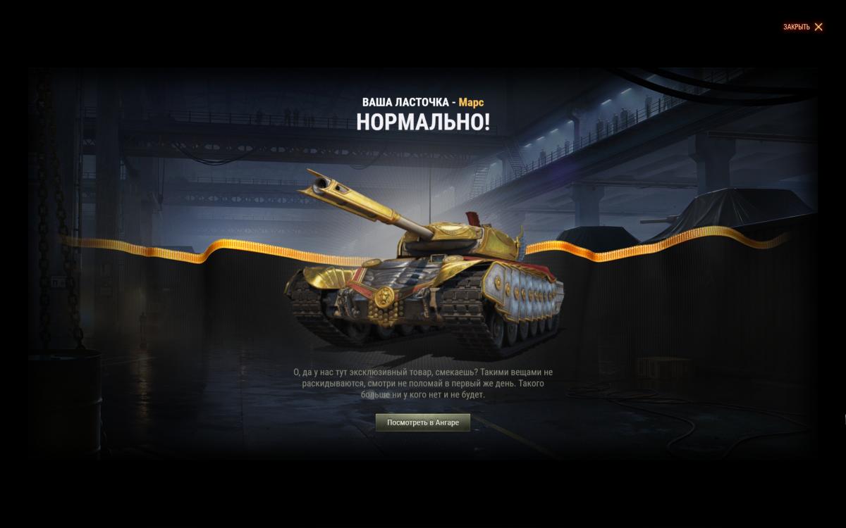 Очень давно хотел танк Марс. Вчера на черном рынке исполнилась мечта. :Smile_smile:  Играть на данном танке реально кайф:Smile_great: 3Д стиль просто отпад. Купил специально для ЛФ :Smile_glasses: Но у меня беда с победами на этом Марсе 5 боев и 0 побед.  Я считаю этот танк жемчужиной своей коллекции. И мне бы очень не хотелось иметь зашкварный процент побед на Марсе. Ну на крайняк 50%   Боги рандома и всевышнего ВБР помогите с победами:Smile_honoring:https://forum-mt-prod.lesta.ru/emoticons/Smile-izmena.gif:Smile_teethhappy: Пожалуйста. Изменено пользователем _PEPSIR_