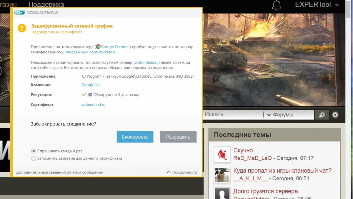 VladimirProgr Опубликовано: 28 апреля, 2018 Игроки 327 публикаций 18 371 бой Жалоба Поделиться Опубликовано: 28 апреля, 2018 (изменено) Почистил кеш, залогировался на сайте и НЕ НУЖНО НАЖИМАТЬ СОХРАНИТЬ ПАРОЛЬ.И будет тебе счастье. А NOD32 может ругаться и не на сайт WG. Во время работы в браузере происходит очень много процессов. Например проверка Удостоверяющих центов протоколов https, проверка установленных плагинов в браузере, ну и сам браузер может производить свою проверку на наличие обновлений... И все это как вы можете понимать происходит ПО СВОЕМУ ЗАЩИЩЕННОМУ КАНАЛУ. Изменено 28 апреля, 2018 пользователем VladimirProgr 1 Помог, не забываем поблагодаритьツ ▲ Ссылка на комментарий Поделиться на других сайтах Другие способы поделиться...