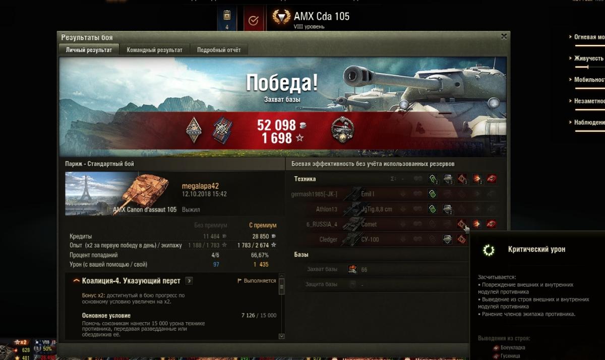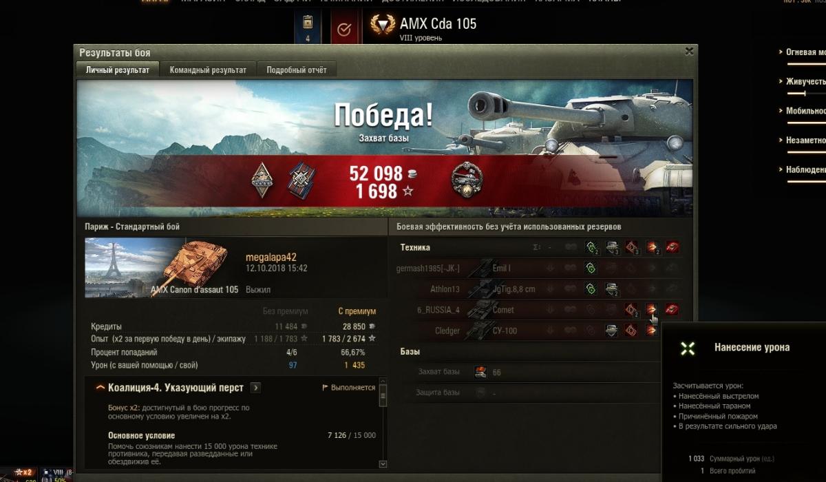 Парни кто раздумывает по трейд ину на амх 105 берите не раздумывая машина огонь, даже с моим 75 % экипажем (к сожалению не было пт экипажа французов) пт выдала отличный бой с первого выстрела !!! снёс бк комету, очень оптимистичное начало динамика есть пробитие есть фарм есть что ещё для счастья нада?! Поменял её на многострадальный знаменитый тог 3 тьфу каерн АХа и доволен как слон хоть от неликвида избавился а то нервы все равно дороже.