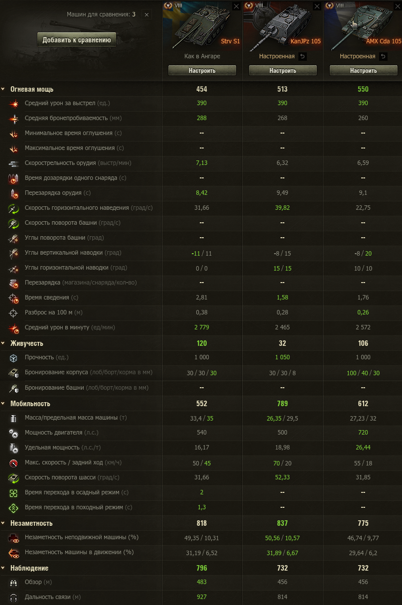 Вот сравнение моих Француза и СТРВ с Ягой 105 Швед с рогами француз с оптикой и вентилем! Экипажи по 5 перков, ББ всё на обзор и  почти 100% маскировку у немца всё тоже самое настроил