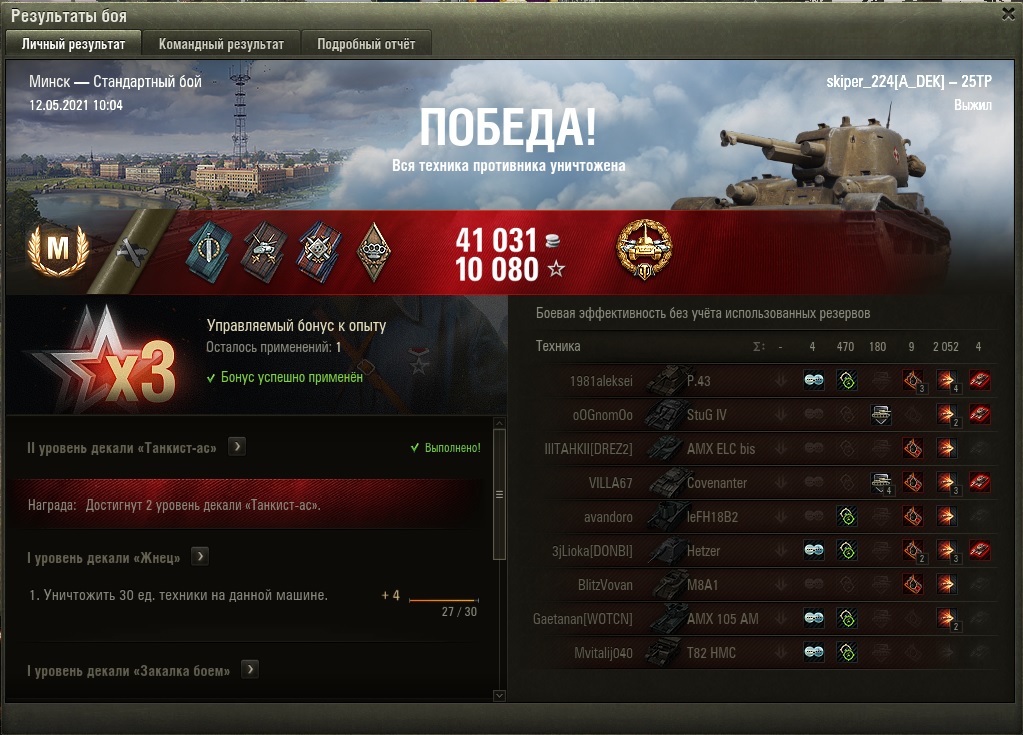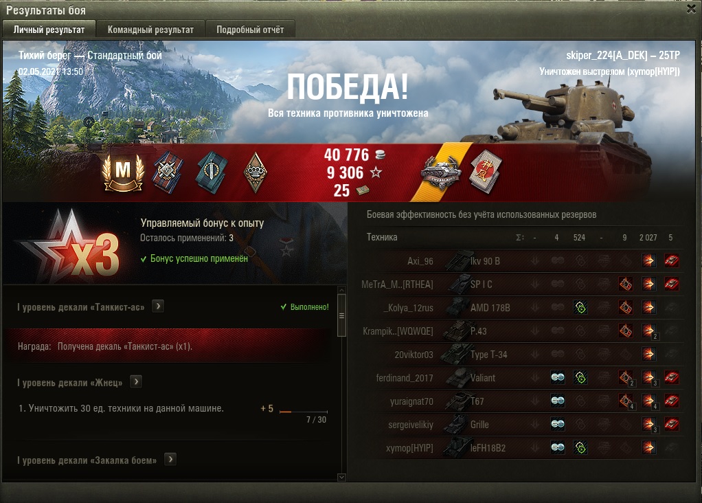 Da3DpanepMa Опубликовано: 23 июля, 2025 Игроки 8 836 публикаций 51 209 боёв Жалоба Поделиться Опубликовано: 23 июля, 2025 (изменено) 4тое прохождение орбиты, в целом 5тое прохождение танка. Хватило 12 боев. Выдал серию в 1252 среднего урона при 2,08 уничтоженных без голды и дорогих расходников. При этом всего 6 побед в 12 боях. Причем не сидел в кустах а все время был на острие. После этой серии склоняюсь что это лучшая 5рка. По отдельным параметрам танк не лучший, но по совокупности танк без слабых мест и универсал. Изменено 23 июля, 2025 пользователем Da3DpanepMa Ссылка на комментарий Поделиться на других сайтах Другие способы поделиться...