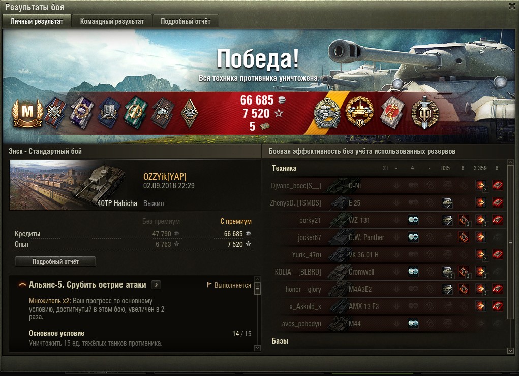 OZZYik Опубликовано: 2 сентября, 2018 Игроки 87 публикаций 60 282 боя Жалоба Поделиться Опубликовано: 2 сентября, 2018 в общем если тебя совсем не асистят то можно и гнуть)Победа!Бой: Энск Техника: 40TP HabichaПолучено опыта: 7 520Получено бон: 5Получено кредитов: 66 685Достижения в бою: «Воин», «Основной калибр», «Камикадзе», «Бронебойщик», «Стрелок», Медаль Оськина, Знак классности «Мастер» Ссылка на комментарий Поделиться на других сайтах Другие способы поделиться...