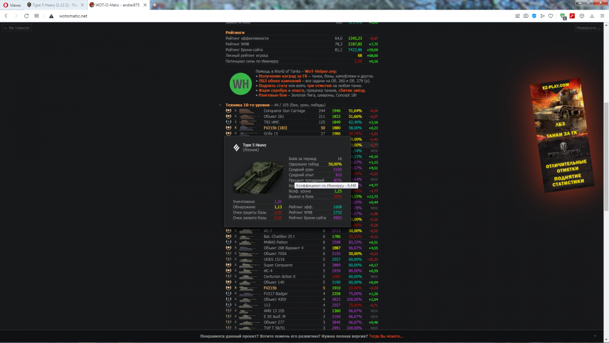 Да ничего с ним. Я его просто не катаю и в него не упираюсь (как и в большинство танков 10 лвл сейчас). Взял чисто для ЛБЗ (вместо Типа), результат меня удовлетворил. Пока не упирался, фармлю на премах. Как ты и советовал, смотрю блогеров и пытаюсь править руки. Где-то получается, где-то нет (см. статистику выше). И при всем при этом мне Маус нравится! Реальный супертяж про танкование, который еще и злобно огрызается. Даже с моими кривыми руками он может, и геймплей на нем приносит мне удовольствие (это цель игры, напоминаю).