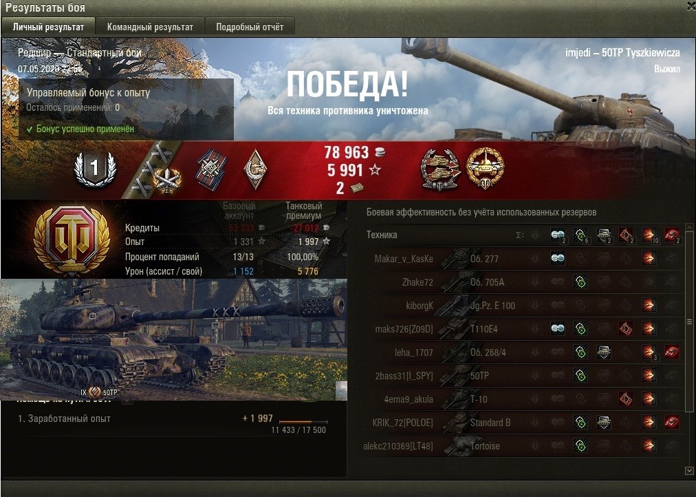 Я сегодня продолжил и у меня почти получилось повторить. Несмотря на то, что два боя были с чистым нулём. Может, я в три отметки смогу? :)