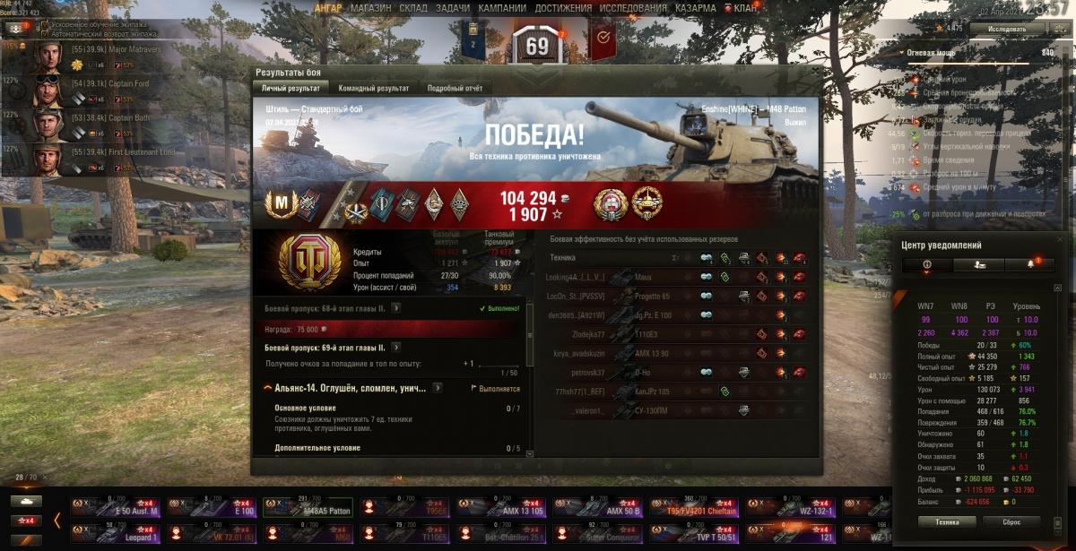 Недавно купил Паттона. В целом разочаровал танчик. Очень скиллозависимый Паттон. Где-то и сам тупил конечно. Но в последнее время вроде получше пошли дела. Пуха кстати у него классная. Не согласен с теми, кто пишет про косую пуху. Пробитие, урон, сведение, точность, перезаряд - все супер. Даже на расстоянии редко мажет. Но вот другие сильные стороны тяжело реализовать. Отличные УВН непросто реализовать, так как кидает чаще на маленькие и городские карты, на ту же прохоровку или песчаную реку раз в год кидает. Обзор реализовать еще трудней ввиду огромных габаритов, всегда светишься первым. Даже вкачанная маскировка на 75 процентов не ощущается. Про броню писать нет смысла, только башня не всегда пробивается. Этот танк вообще не прощает ошибок ввиду больших размеров и слабой брони, да и скорость слабенькая.