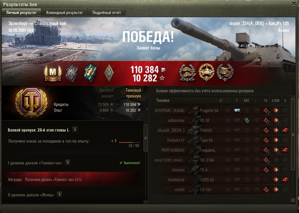 Всё!!! Снял камуфляж и оборудование. Провёл в общей сложности 202 боя, из них - раз горел, раз - взорвали боеукладку. Прошёл 14 уровней БП (кинул первым, что бы успеть набрать 400). Из положительного - скорость движения и неплохая скорость разворота, как для ПТ, так что есть возможность быстро перетянуться с фланга на фланг, что же касается быстрого занятия позиций, так таких карт и десятка не наберётся... Ещё к плюсам, как у меня - неплохо балансило... Теперь о грустном, здесь писали, что стабилизация орудия на троечку, я бы поставил единицу - стабилизации нет от слова совсем, так что, стрелять по быстро движущимся танкам, та ещё морока (стрелять на ходу можно даже и не пытаться). Маскировка - посредственная (огромный сарай), обзор - посредственный, перезарядка - посредственная, впитывает всё пролетающее мимо (засвет - ангар).