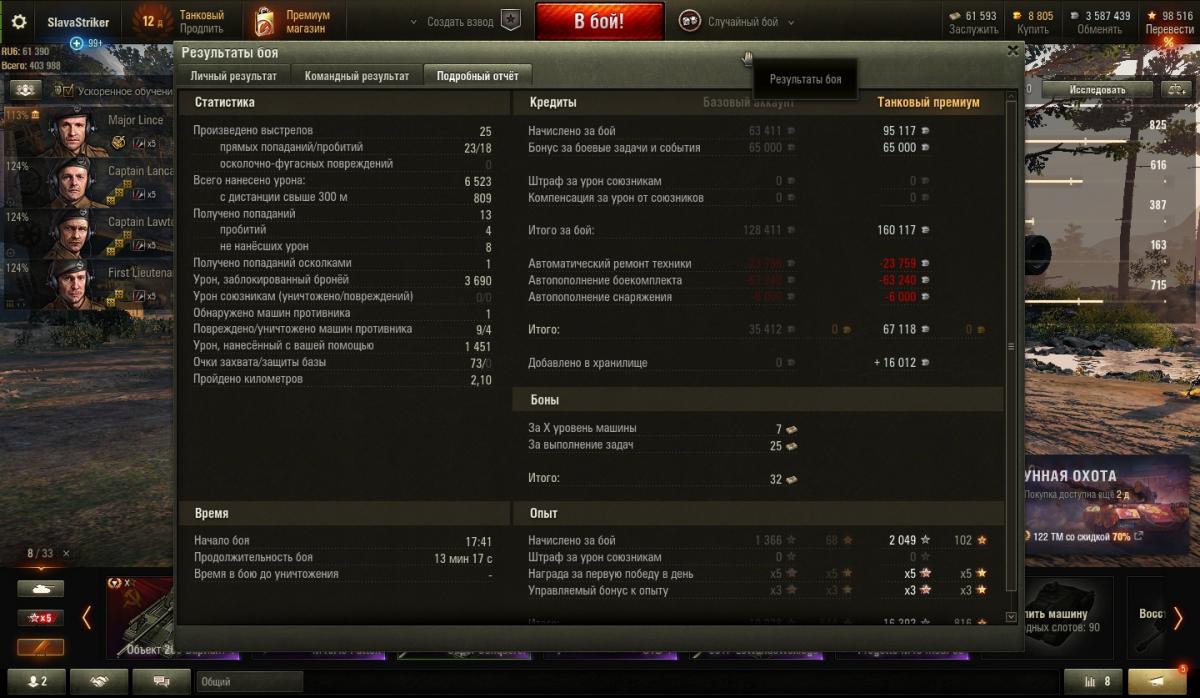 Только что из боя. На Песчаной реке, с 3-мя очень сложными гемплеями, пополз туда, где обычно СТ тусят, только вот туда, куда поехал я, поехали только Об. 277 и СТБ-1. Встали на отстрел прокатки, Об. 277, увы, закончился. В итоге при прикрытии одного СТБ-1, выстоял против 60ТР, Т110Е5, ИС-7, 2-х СТБ-1 и М48А5. Бой закончил с 5400 дамага, 4700 натанкованного, 2180 насвета. Было весело :justwait: