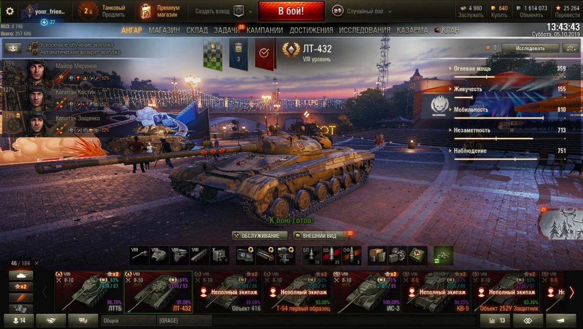 Так что я не считаю правильным качать один экипаж, да ещё при наличии большой кучи танков в ангаре, ибо в любой момент я могу выехать на любом танке,, хоть на т-150, хоть на вк3001, хоть на м46 паттоне.
