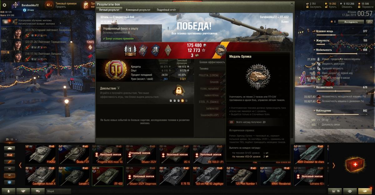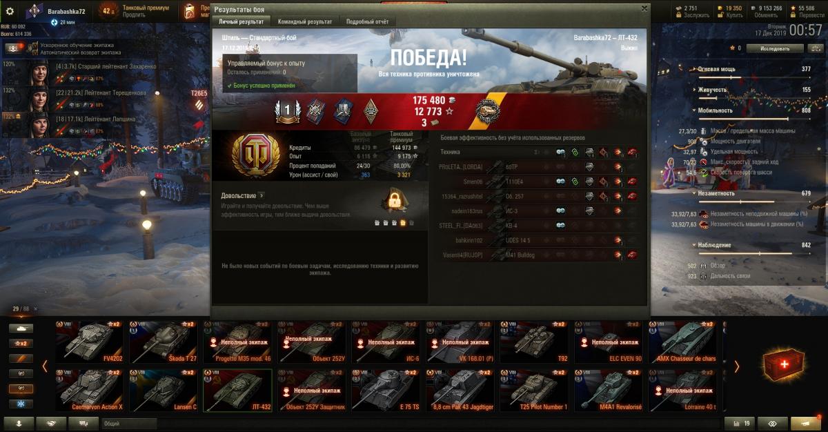 Всем привет! Отпишусь и я. Взял за голду с коробасов. Брал 20 шт восточных, выпал с них СУ 130 и 7к голды, пару стилей и мелочевка, 19 дней према. Имею в ангаре колесного према, и ебр 105. Поставил оптику за боны, вентиль, стаб обычные. Сыграно уже 50 боев, горел один раз. Катаю с доппаем. Экипаж сначала вкачал до 3 перков, потом пересадил с об. 430 5-перковый, а этот туда отправил. Максимальное, что дал по засвету это, 6 тысяч на Малиновке. Был три раза на Прохоровке, сливался с нулём, обидно, но меня пересвечивали. Из своих ошибок, которые вижу, это то что гоню как на колесе вперед и сливаюсь. Вообщем не заходит пока. На линии фронта воткну досылатель взамен вентиля и буду гонять. В рандоме пока туго, буду дальше сливать. Бои в основном слабые. На колесах прокачиваемых и преме в разы результативнее и интереснее играть получалось, а самое главное там почти каждый бой было что вспомнить) тут даже понимаешь, что 500 м обзора почти, но либо никто не светится, либо тебя сбривают, либо держишь в постоянном засвете, союзники не стреляют/не попадают/не пробивают. Если не считать неудачи, от танка не горит, погонял, слился, над ошибками подумал и дальше)