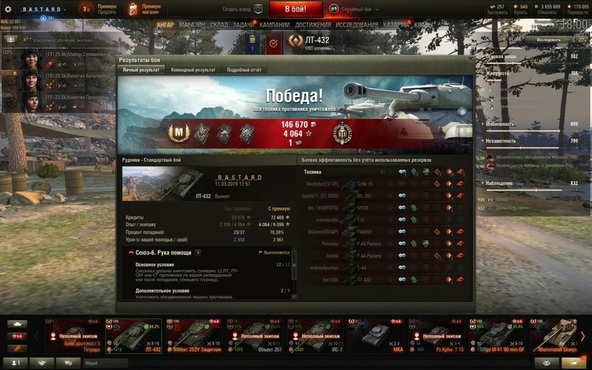 Офигенный танк - если на прошлом лф я катал ёлка/сом/защечник (половину делала елка), то теперь тоже самое, но где-то 60-70% от боя лежит в 432, классная тачанка.