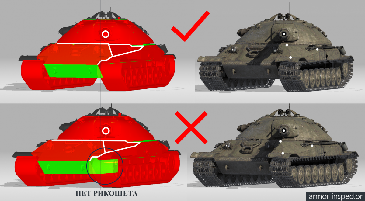 Вот картинки, наглядно показывающие как ставить танк, для танкования бортом от стены, чтобы нижняя часть борта рикошетила и через каток не пробивали.