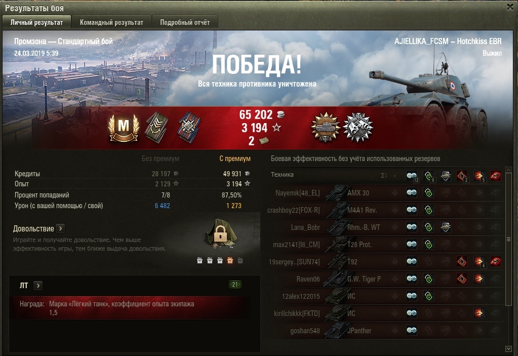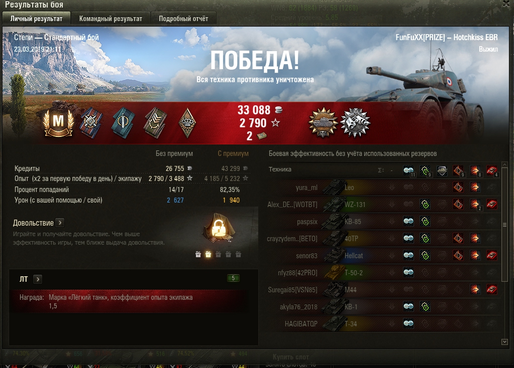 В целом отличное ведро, осталось докачать 40к, из-за ЛФ перестал выкатывать, сейчас начну обратно, чтобы к середине апреля был топовый 8 левел. Машинка веселая и динамичная, сперва катал со стабом вместо досылателя, потом поменял, по ощущениям стало сложнее попадать на ходу, но в целом мне нравится такой геймплей, хотя считаю, что дальше уже идут имбоватые машины, на ЛФ от колесников нет спасения, сильно мешали.