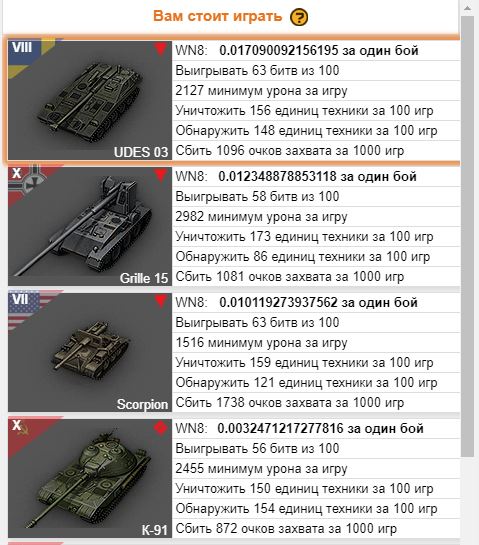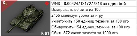 Года 2 даже результаты боя не смотрю, тем более стату на технике. Играю по фану. Если мне комфортно на 91-ом играть, то играю. А на счёт поднятия статы, всё индивидуально - калькулятор рейтинга эффективности (http://wot-news.com/). И средний урон тут не причём, а главное на каком танке меньше статюги играют. Вот играю на Лепарде и К-91. Средний урон почти одинаков 2,5к. Обе машины комфортны для меня. Но!!! Коэффициент WN8 на моём акке для К-91 (WN8=0.0032) в 3,5 раза лучше чем на Леопарде (WN8=0.00095). Ну, а на Юдесе вообще ТОП-1 по акку WN8=0.017. Ещё Скорп М56 мне норм WN8=0.010. Каждому своё. Играя по фану на Скорпе М56, потом на Гриле, далее на Юдесе (9к боев) я поднял стату с желтого игрока. Так что ребята советчики - лесом... http://wot-news.com/ калькулятор рейтинга эффективности нам в помощь:izmena::trollface::honoring: