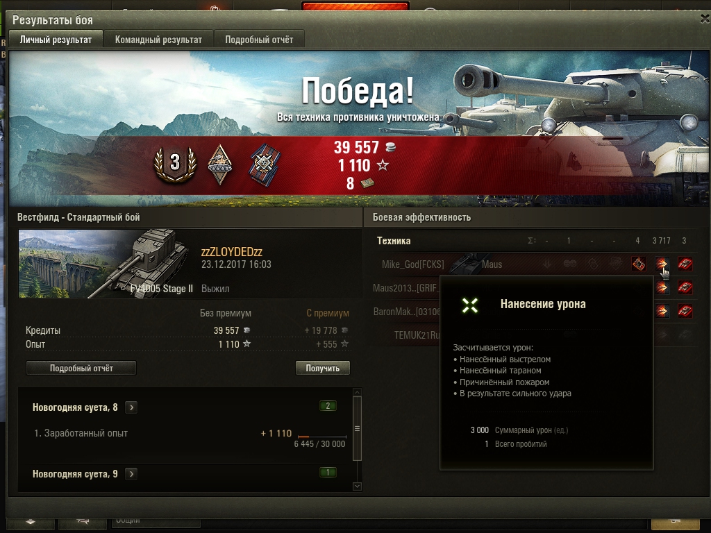 P.S.2 В том же бою, я не пробил борт башни черному властелину... Картофельная игра посчитала, что 300мм пробития, маловато для шотного картонного тяжа 7-ого уровня.