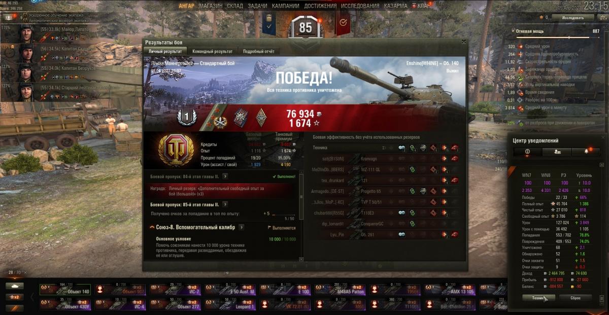 Года два не играл на 140, хотя раньше только на нем и играл. Лишний градус в угла чувствуется очень приятно. Сыграл вчера 5 боев. Сам не ожидал для себя средуху в почти 3000. Установил компоновку и ни разу не подожгли - сразу появилась какая-тот уверенность. В сравнении с тем же леопардом круг прицела довольно-таки большой, но, что приятно, пульки летят почти всегда в середину. 5 боев - не статистика, но какой-то показатель. 5,13 перезарядка, конечно, угнетает соперников, когда фаршируешь их снарядами. Пошел за второй отметкой. На третью не претендую, кончено, суммарка там лютая, наверное.