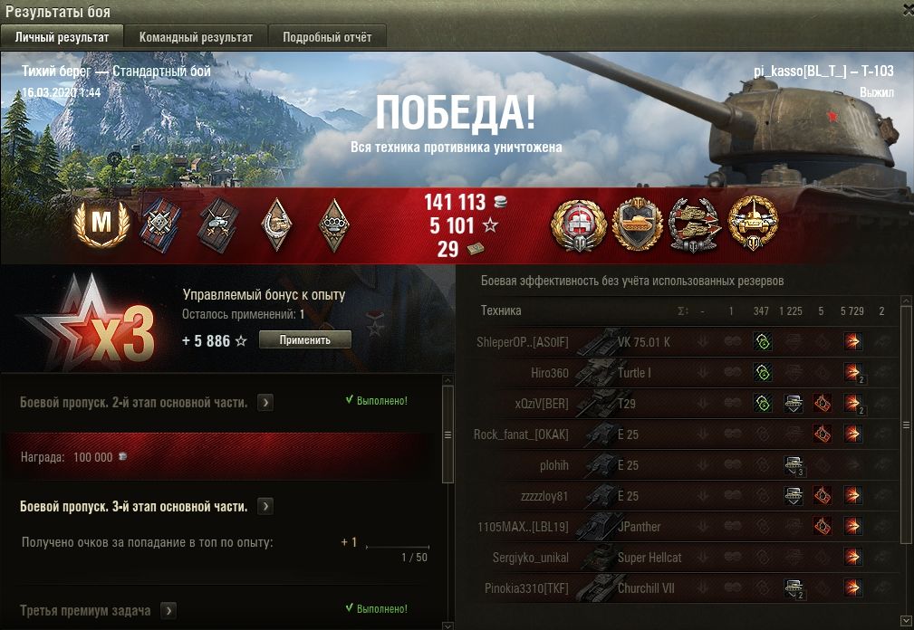 Очень понравился танк. Когда его впервые выпустили в продажу, я не играл в танки, подзабил, когда вернулся, то всё ждал, когда же его вновь кинуть в продажу и вот дождался. Но у меня простая история, по сути как у всех со своими любимыми танками, можно купить любой, даже самый странный танк, и если он тебе чем то нравится, то не замечаешь косяки и пытаешься реализовать по максимум всё что можно из него выжать. Вот и со мной так. Ибо мой КВ-5, старый любимчик в хлам убили, и в т-103 вижу некоторую модифицированную замену ему.
