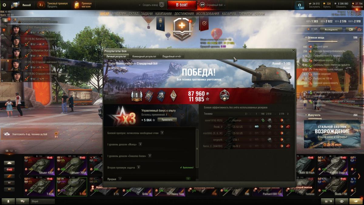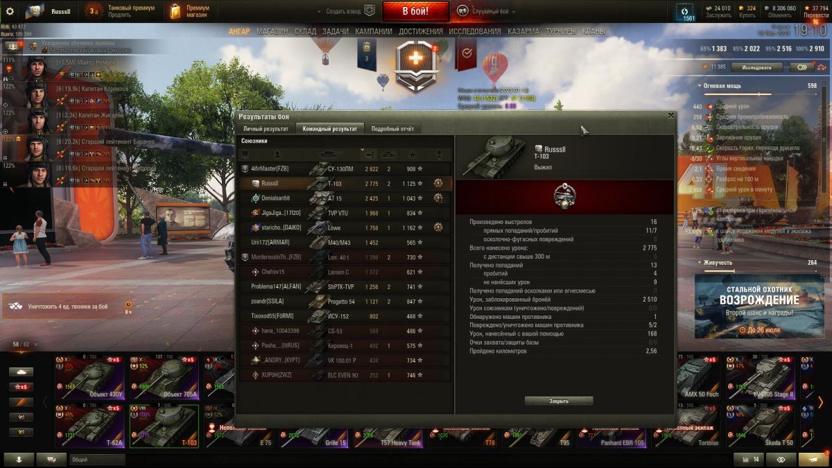 Как вторая сборка нормально,это когда внизу списка и открытая карта ,я для первой сборки катаю- досыл в слоте ,умп  трофейный  и либо Вент трофейный либо закалка.Сейчас заменил Вент на комплекс повышения мобильности.У Т-103 проблема в медленном вращения башни да и сам он туго поворачивается,когда замес случается в городе и противников несколько реагировать на медленном и не поворотливом танке тяжко,а так хоть мобильность повышается.У вас смотрю БЗ имеется ,вот вопрос у вас как к обладателю и БЗ и Т-103,вы тоже заметили что  Т-103 является для БЗ неприятным противником,особенно если на Т103 игрок не охраняет куст а едет вместе с группой ТТ и пользуясь рельефом или тушками союзных ТТ просто в крышу башни раз за разом кидает с пробитием по БЗ.