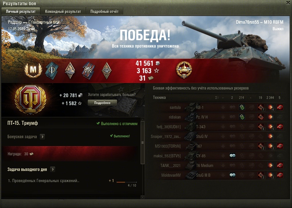 Не рубли же.Ой подумаеш,я ими не дорожу заработаю легко,а че за них дельное купиш?оборудование прибавка которая мизерная% что и не почувствуеш.Бон хватает,и 120лимонов с лишним серебра не знаю куда деть.Играю только до 8лвл,исключение Вт борщ 9лвл и арта Бат.На 10 сами играйте.Прем акк сто лет не пользовался.Так что не жалко,покатаю,надоест ,пусть пылиться.Я описал честно как у меня бои на нем были,как у других не знаю.Но опять же 20 боев это мало,может ты и прав кому жалко боны пусть подумает.На счет двигаться?а я особо не двигался,в куст и пуляю,с СТ не путай.иТ67 в ангары отправлял.))Я допустим на 4лвл су85б стоя в кустах заряжу фугасы и по алее будут ехать 3 5лвл т67 и я их троих отправлю в ангар и они меня не увидят ,это же не значит что су85Б лучше.Просто каждый играет,и тактика взависимо от ТХ танка.Но есть в ветке экземпляры линейные и премтехника обсолютное Г....,но M10 RBFM к это не похож,так себе на 3+.