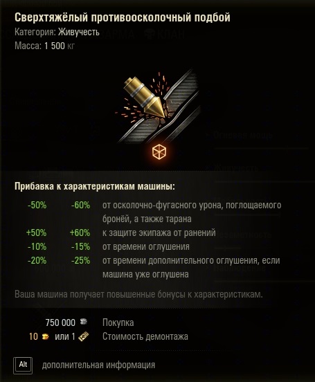 А подбой работает не так. Он добавляет +60% абсорбции брони. Т.е. если броня, в месте расчета урона была 100мм, то при установленном подбое будет 160мм. На конечный урон это влияет слабо, будешь получать, условно не 400, а 350.