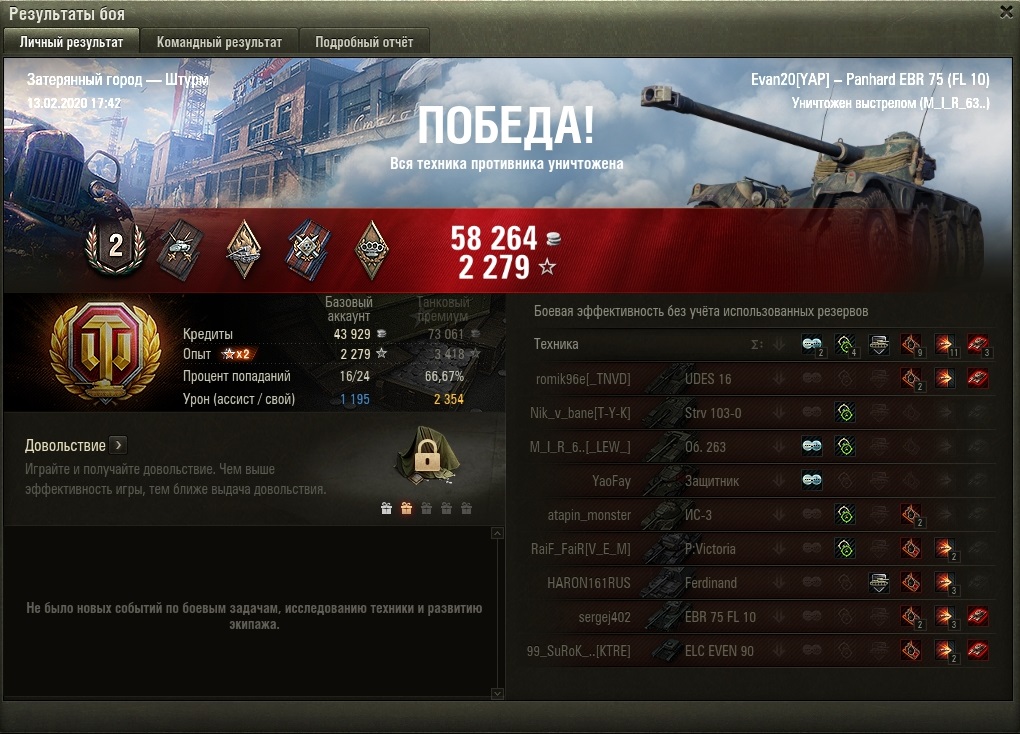 Начало боя откатал снизу, отогнал и убил ёлку, потом в городе пострелял в спины рубящимся красным, потом поехал спасать арту от их ЕБРа.  В общем, эндшпиль, у них остались 263 и стрв 103 по углам, две арты в кустах по центру.  Решил зайти в тыл 263, т.к. на том фланге вообще не светился, выкатываюсь из-за камня, а он сведен прямо на меня, хотя по центру и базу берут и арту режут. Ну профи думаю, сообразил шельмец. Смотрю в итоговой таблице, а это блин его единственный результативный выстрел за бой вообще, 10 ,самка собаки, моих ХП. В топе, в обороне на штурме. (╮°-° ) ┳┳ ............... ( ╯°□° )╯┻┻