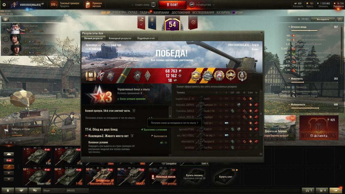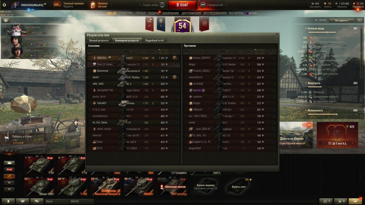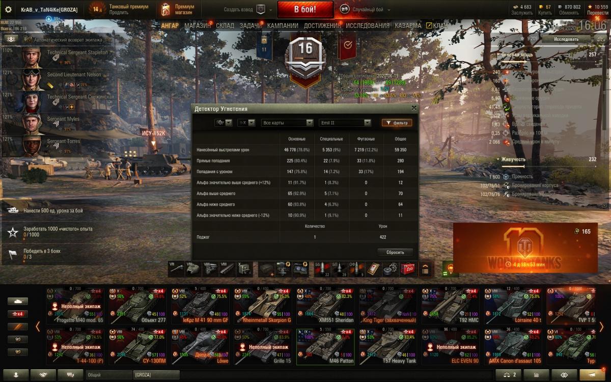 Ну чтож провел 160 боев.Средуха 2200 и 1 отметка.В целом танк хороший,но очень ситуативный. Кажись, что разрабы имеют обиду на шведов и занерфили данную ветку.Самое удивительное проходимость танка. Я вот не пойму, почему такая плохая проходимость, масса в районе 36 тонн (точно не помню), и танк имеет широкие гусеницы, так почему он имеет такое сопротивление грунтов, где тут логика. Логичность в этой игре отсутствует, тот же Е 75 на асфальте не сильно отстаёт от нас потому, что начиная с Тигра 2 и до Е100 имеют отличную проходимость и даже со слабой удельной мощностью (у всех кажись в районе 10 лошадей/т), на средних грунтах и на ровной поверхности, эти немецкие тяжи могут ехать на 25-30 км/ч, а тут Емиль 2 с 14.76 лошадками на тонну не может по асфальту превысить 35 км/ч. Данной ветке нужен микро ап. Я бы лично улучшил 3 характеристики: проходимость, количество HP и КД между выстрелами. 8 и 9 лвл нужен существенный ап проходимости и 10 незначительно, потом 8 и 9 лвл накинуть по 100 ХП, а десятке 100 или 200. И в третьих, пусть у 8 останется 3 сек, а у 9 2.75 сек и Крану 2.5 сек. С такими характеристиками ветка станет комфортной. Но главная претензия к ПРОХОДИМОСТИ.