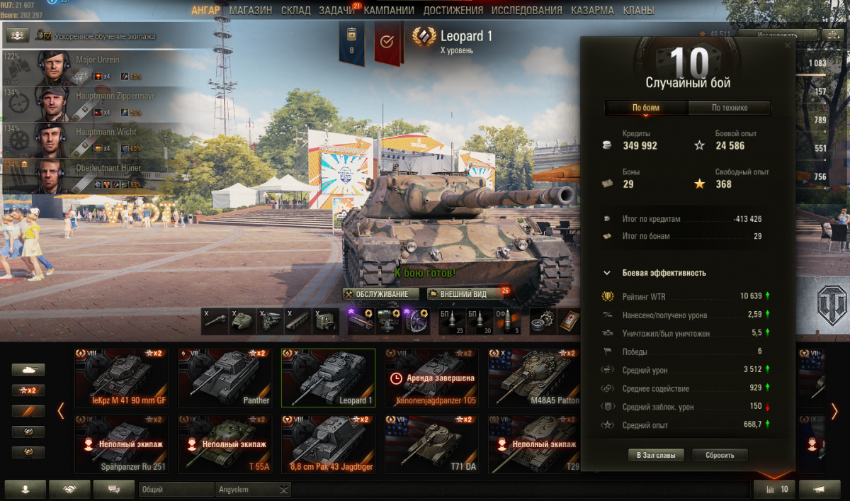 Не могу сказать, что сейчас я хорошо играю, а даже думаю наоборот. Карты выпадали и подходящие, и не очень. Повезло с тем, что не было турбачей. Итого, на полном фарше и очти идеальным экипажем леопольд позволяет играть довольно недурно и выдавать неплохие результаты. Есть только один нюанс - 70км/ч набираются раз в год и толку от апа максималки в районе нуля. Нужно или откатывать этот ап с параллельным апом еще какой-то характеристики (маневренности или скорости назад) или сделать так, чтобы все же 70км/ч достаточно быстро и стабильно набирались.
