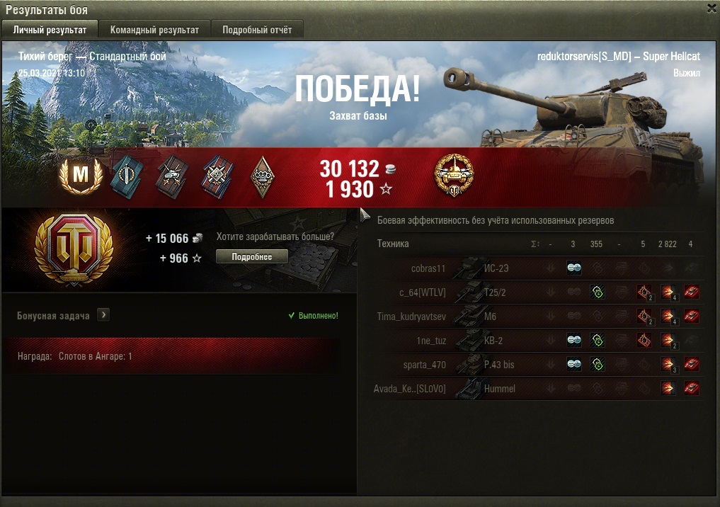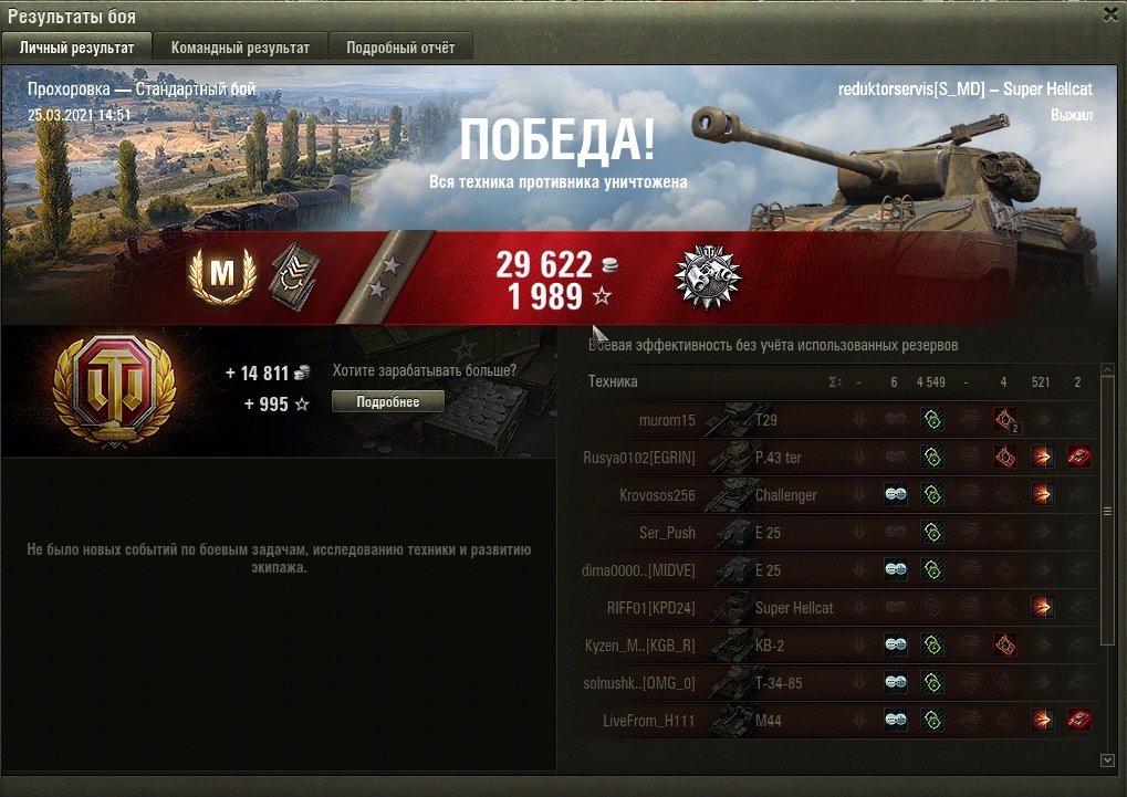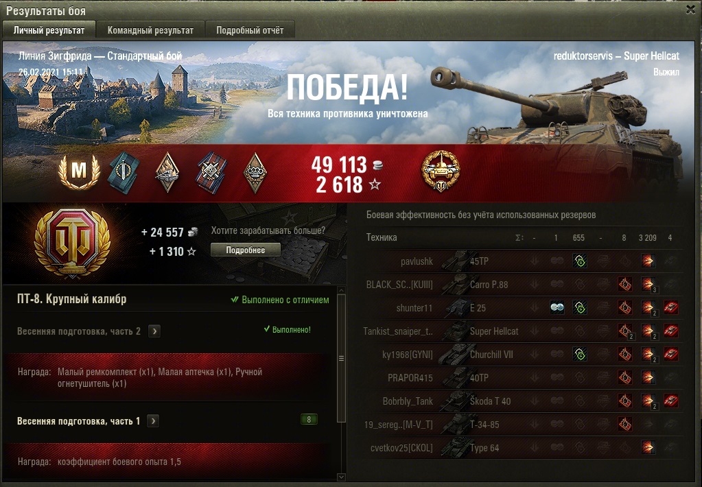 Расскажу за сетап : "Фаза" - 45%, "удес16" - 46%, "STA2" - 45%, "Т 110" - 45%, "ikv90b" - 46%, "т34/100" - 46%, "т29" -44%, "т34/1" - 46%, "strvS1" - 47%, "Mauerbreher" - 47%. И у этих "деятелей" под 100к. боёв у некотрых. А у двух даже за сотню тысяч. Об.704 наш простоял у базы ничего не настреляв. Тащили по итогу мы втроём - "703 ll(122), и т28нтс.