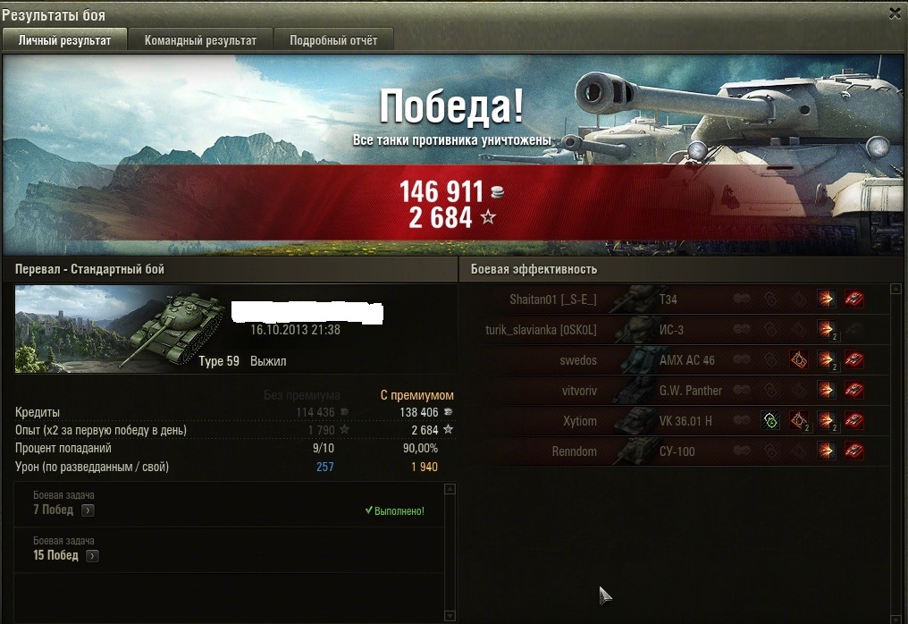 2. Тип59, 3400, 110к чистыми с премом: http://wotreplays.ru/site/1414702