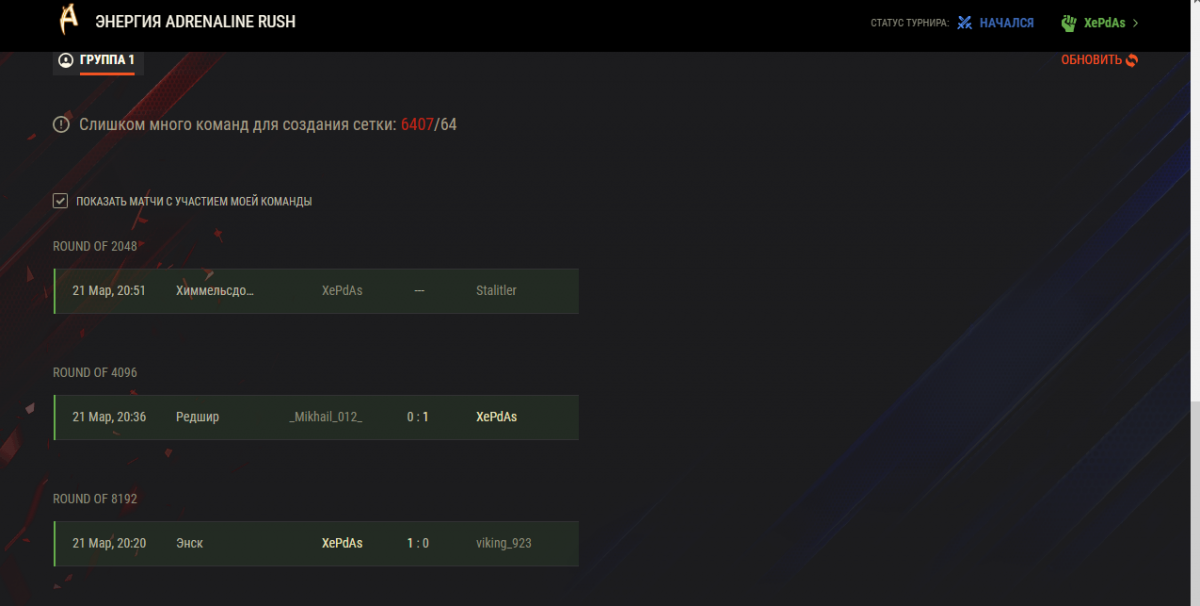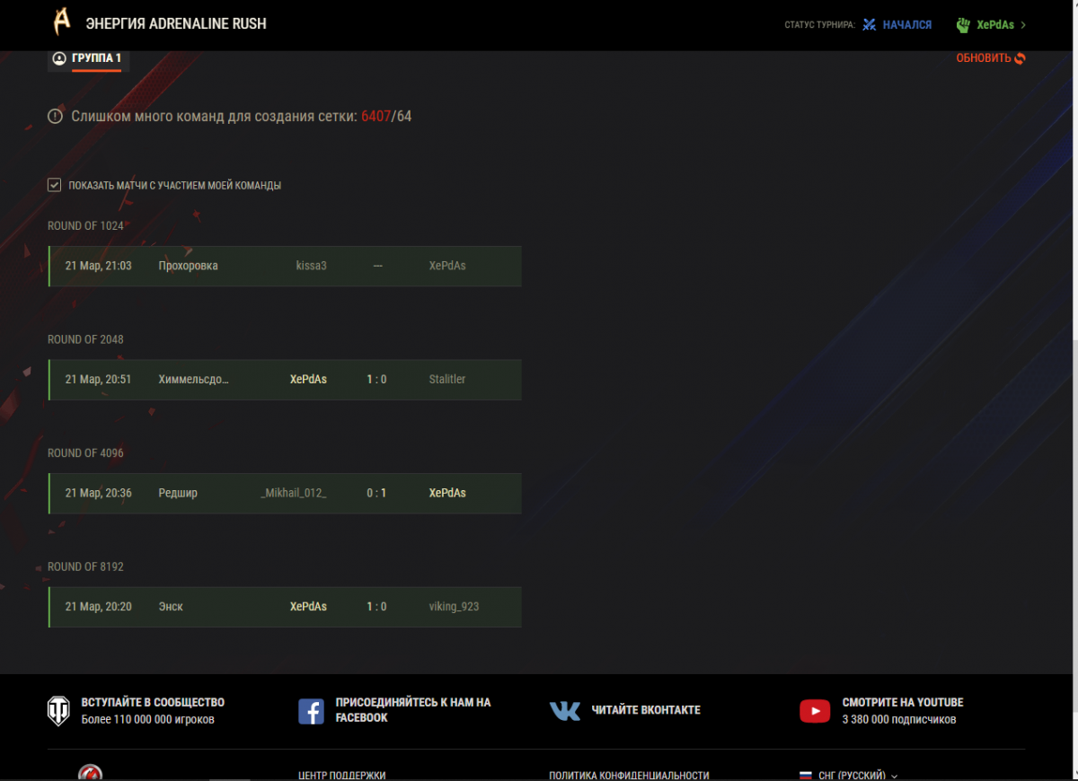 MEGAT0NN Опубликовано: 21 марта, 2020 Игроки 1 718 публикаций 27 498 боёв Жалоба Поделиться Опубликовано: 21 марта, 2020 http://cdn-frm-eu.wargaming.net/4.5/style_images/mobile/snapback.pngXePdAs (21 мар 2020 - 17:28) писал:https://worldoftanks.ru/ru/tournamentsЗаходишь под своей учеткой справо сверху,а потом нажми на Адреналин турнир,дальше разберешься...Так так и делаю, хоть убей нету вчерашнего 1-го отборочного в результатах Оо Ссылка на комментарий Поделиться на других сайтах Другие способы поделиться...