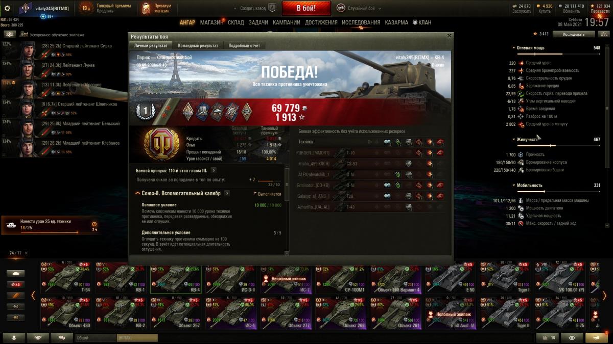 Короче, провел 5 боев. В 5 бою: Мастер, Основной калибр, Стальная Стена. Союз-15 на Химмеру с отличием, ТТ-12 на т-55а с отличием. Все сделал за 5 минут, потом старался выжить (условие ЛБЗ с отличием). Из 5 боев среднее танкование почти 4к. Жесткий КВ с кепкой, это вам не КВ с сиськой.