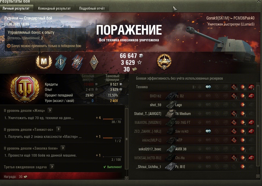 Не могу выиграть на танке второй месяц, после того как выкупил пару побед боев за 50, взял мастера за поражение с 4ками, жаль что нельзя запретить союзникам лететь сливаться с первых секунд. Прошлый мастер был тоже за поражение, настрелял 2200 урона 8 фрагов, скрины не сохранились так как удалил игру. В целом, отдохнув какое-то время в песке, могу сказать что играть в нем абсолютно неинтересно, все бои на 3-5 уровнях одинаковые как под копирку, нету никакой сложности и думать не надо.