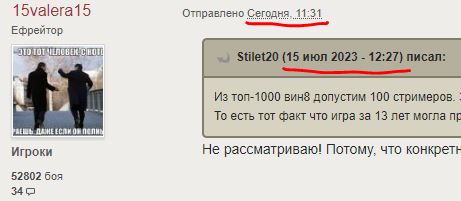 Shadowbeast Опубликовано: 20 февраля, 2024 Игроки 17 911 публикация 100 746 боёв Поделиться Опубликовано: 20 февраля, 2024 20 фев 2024 - 14:16 пользователь podkustnik сказал: на имбе, на которой у любого 50% игрока было 2.5к средухи, ты наиграл 3500 боёв со средухой 2к без мозга, ок потом, в 2016 году, появился гриль - но мозг у тебя продолжал отсутствовать , всё правильно? ведь и на нём ты отыграл 1к боёв со средухой менее 2к , наверное пару лет то отыграл? 8 лет отсутствия мозга и вдруг внезапное озарение и понимание игры надо же, как бывает Моцк начинал использовать, вон маус в 2300 игрался, а эстонец в 2480. А потом мне стал нужен чиф и пришлось учиться играть, чтобы взять хотя бы 279. Какое озарение? Переход на голду дает прирост 1-2 тычек. Понимание того, что не стоит стоять тупо в кустах еще 1-2 тычки. В итоге ты уже вместо 2000 играешь в 2500, а то и почти в 2800-3000. Ссылка на комментарий