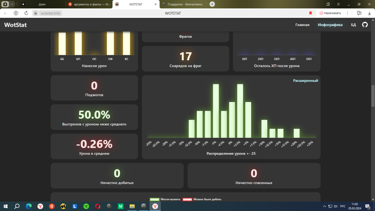 _Koshej_ Опубликовано: 4 марта, 2024 Игроки 23 114 публикации 62 223 боя Поделиться Опубликовано: 4 марта, 2024 04 мар 2024 - 20:09 пользователь Mr_Saymon_Smit сказал: руинберг.сразу поехал на центр. вот весь мой ассист. враги светятся и убивают наши танки. не будешь давать урон,будешь меньше влиять на бой) Та це понятно. Криворукие орлы подобные недавнему пациенту, редко могут попасть. Но на дистанции умелая игра на лт роляет и без больших уронов.А на Руинберге от гряды кустов в центре нередко топовые бои выходят. Достойна доля того кто правыйШирокий выбор, благое благоВершить заслоны, смотреть под ногиИ оставаться стерильным гостем Ссылка на комментарий