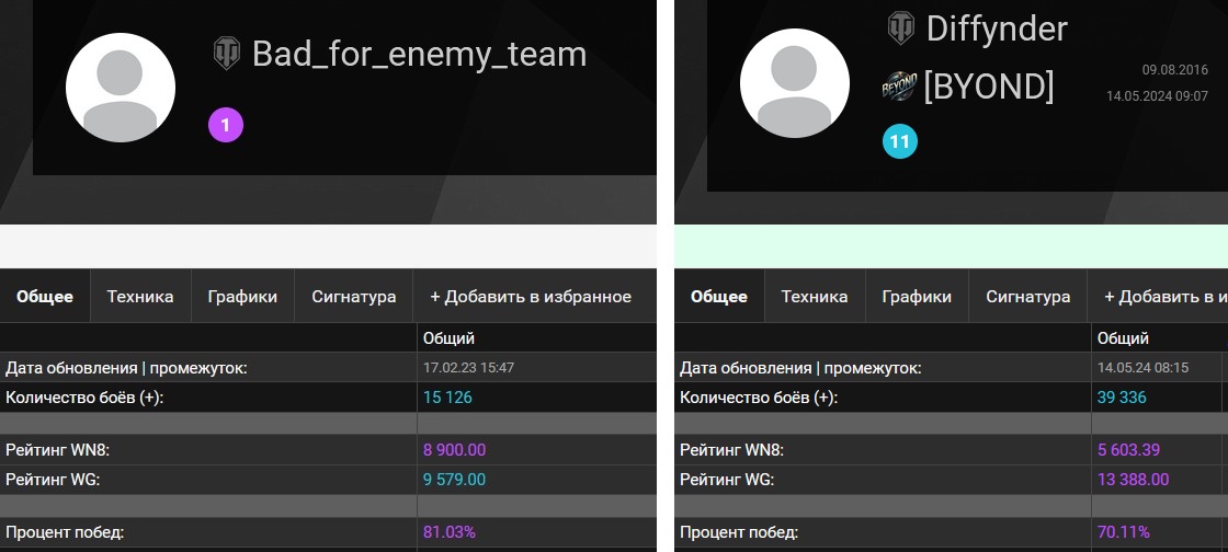 EBR75_fl10 Опубликовано: 20 мая, 2024 Игроки 18 372 публикации 15 001 бой Поделиться Опубликовано: 20 мая, 2024 (изменено) 20 май 2024 - 13:01 пользователь Viasat83 сказал: Что точно? Ты получается влез в разговор не понимая о чем он. Вот Диффундер: Он играет на 4000 вн8 даже в худшие дни. Ты мне притащил каких инвалидов на 1100 и 2500 вн8. Ну так никто не говорит, что дифундер плохойПросто по вн8 он немножко отстаёт от лидеровИ по победам кстати. Изменено 20 мая, 2024 пользователем EBR75_fl10 Мой TELEGRAM: https://t.me/EBR75_fl10 (ССЫЛКА) Ссылка на комментарий Поделиться на других сайтах Другие способы поделиться...