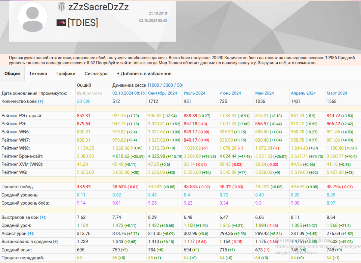 _Koshej_ Опубликовано: 2 октября, 2024 Игроки 23 025 публикаций 61 875 боёв Жалоба Поделиться Опубликовано: 2 октября, 2024 (изменено) 02 окт 2024 - 08:20 пользователь 3metra_nad_yrovnem_dna сказал: Не ну ты посмотри сколько боев за сентябрь (О_О)https://forum-mt-prod.lesta.ru/monthly_10_2024/post-34375601-0-32930900-1727857154_thumb.pngВот как только он перестанет играть на 10ках и на некоторых 9ках, так у него сразу пропадут турбачи. Ему кстати некоторые ТТ и ПТ незаходят, не его это, но он продолжает на них играть.https://forum-mt-prod.lesta.ru/monthly_10_2024/post-34375601-0-66028000-1727857217_thumb.pnghttps://forum-mt-prod.lesta.ru/monthly_10_2024/post-34375601-0-91579100-1727857227_thumb.pngда ему по ходу другой аккаунт прибанили, он на этот вернулсятам же типикал ноулайфер пенсионервозможно с модиками интересными играетибо на каких-то танках у него слишком нормальные показатели, учитывая уровень интеллекта Изменено 2 октября, 2024 пользователем _Koshej_ Достойна доля того кто правыйШирокий выбор, благое благоВершить заслоны, смотреть под ногиИ оставаться стерильным гостем Ссылка на комментарий Поделиться на других сайтах Другие способы поделиться...