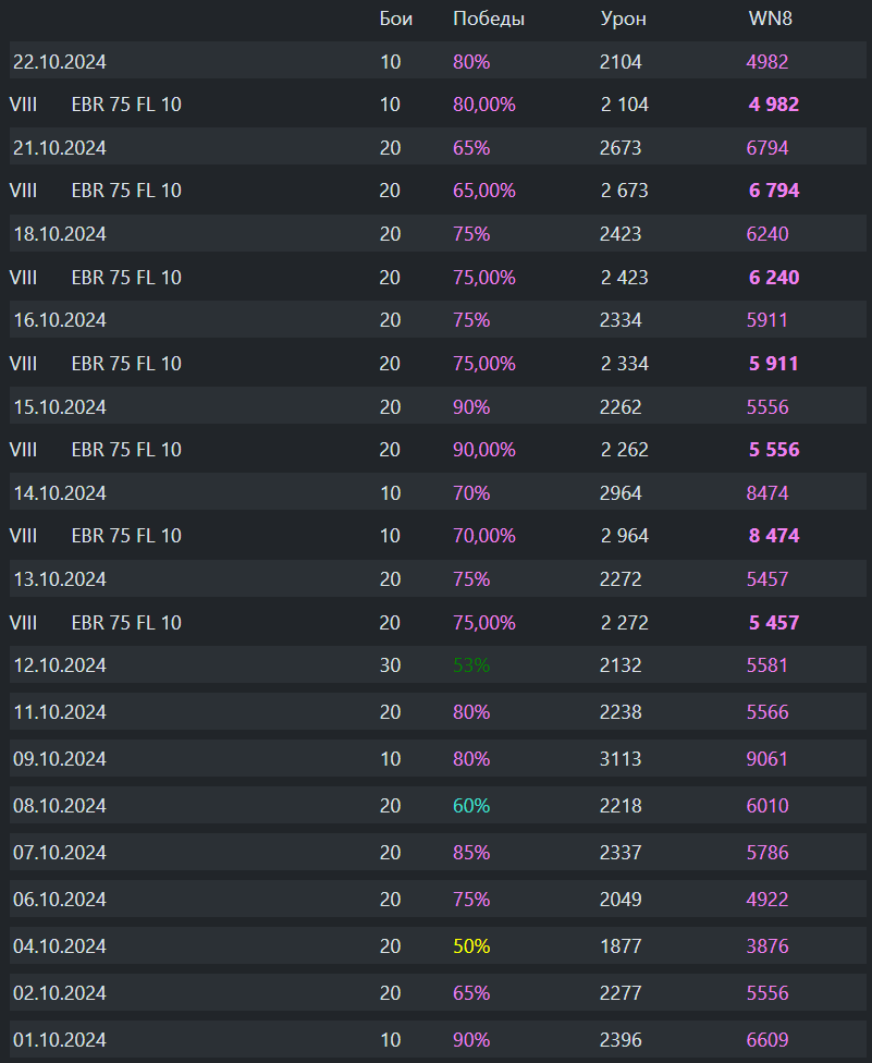 IXVitae Опубликовано: 22 октября, 2024 Игроки 1 665 публикаций 104 194 боя Поделиться Опубликовано: 22 октября, 2024 (изменено) 22 окт 2024 - 09:49 пользователь JIT_BuHoBaT сказал: отбросим все эти не пробил, а меня пробили. за 300 боев 45% но ведь очевидно, что ты его не правильного готовишь. Нет? Крайний 5-й бой в сегодняшней сессии, чуть получше со снарядами, но все равно слив. 1 победа из 5 боев. Если бы победы были важны мне, уже давно бы удалил аккhttp://tankireplays.lesta.ru/site/14590122#zapolyar_e-tadream-kunze_panzerПожалуй, ты прав, но я пока не вижу для себя другой манеры игры, исхожу из того, что в рандоме, и играю по формуле один против 29. Еще одно наблюдение- не получается катать подряд на каком- то одном танке- все идет вниз по экспоненте. Приходится прыгать по танкам. Изменено 22 октября, 2024 пользователем TaDream Ссылка на комментарий