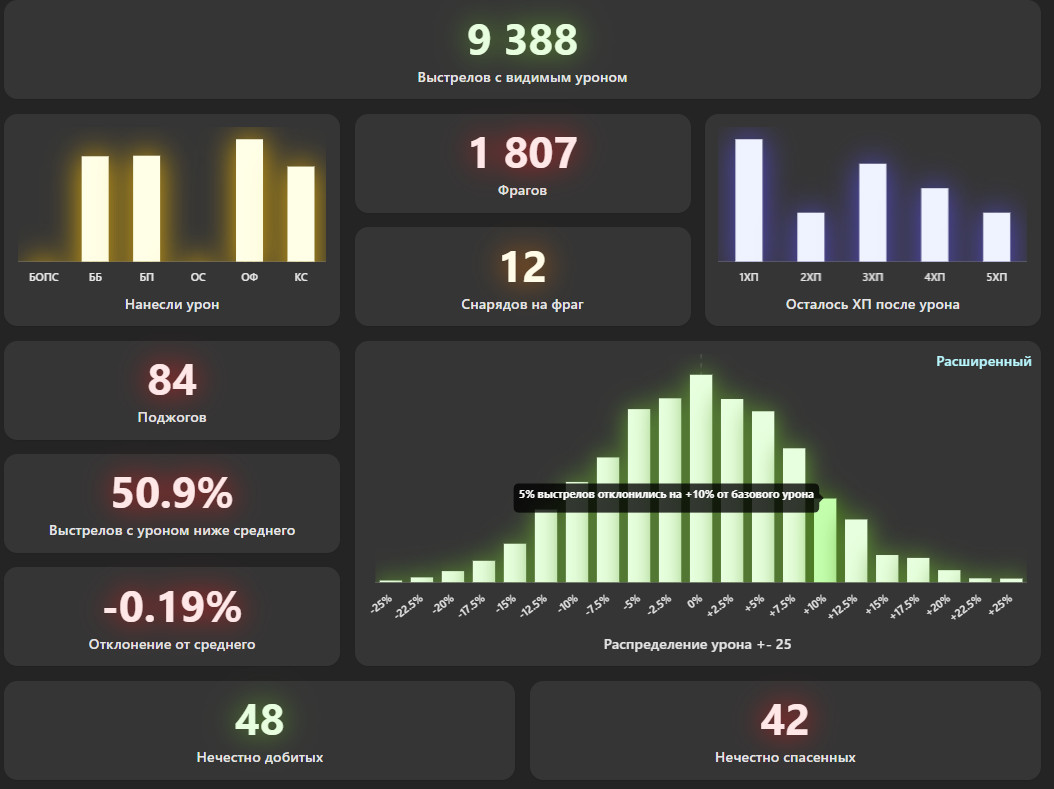 Shadows_in_me Опубликовано: 12 ноября, 2024 Игроки 25 695 публикаций 82 859 боёв Поделиться Опубликовано: 12 ноября, 2024 12 ноя 2024 - 12:52 пользователь EBR75_fl10 сказал: Для всего пула значений да.А для игрока, использующегоСвою часть пула, - распределениеЕдва ли будет выглядеть нормальным, Даже если предположить, что оноСлучайное) Ну приносили же ссылку совсем недавно 11 ноя 2024 - 11:51 пользователь Shadowbeast сказал:Ну если ты не ставил такой мод, то можешь поставить и посмотретьЯ вот например в минус играю на целых 0.08%Spoiler https://wotstat.info/session/damage?nickname=Shadowbeast . Могу ещё добавить картинку своей части пула https://forum-mt-prod.lesta.ru/monthly_11_2024/post-17511936-0-77301900-1731412165_thumb.jpg. Насколько это распределение выглядит едва ли нормальным? Ссылка на комментарий