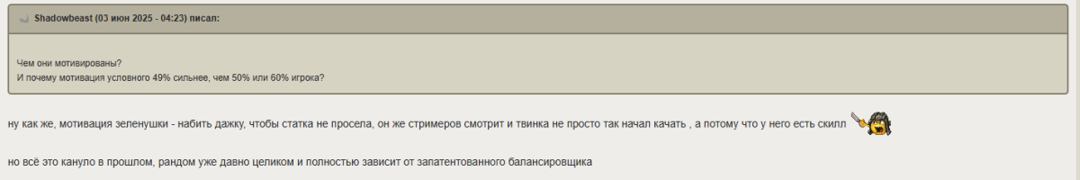 JIT_BuHoBaT Опубликовано: 3 июня, 2025 Игроки 6 562 публикации 9 654 боя Поделиться Опубликовано: 3 июня, 2025 03 июн 2025 - 13:12 пользователь ermak_79 сказал:Мне вчера такой попался, старающийся Ласвилль, 49% чел на риночеронте, бой с 8 лвл, ну бросто бери и пользуйся. Старающийся встал в к1 за горочку и старался оттуда изо всех сил, как мог.Я катал на эрихе концепте, поехал на перевал и развалил там все - подкрутили в том бою, летело хорошо. Чел на рино приехал, когда уже дальше можно было проезжать, как итог - дал 1,4к весь довольный сам собою.Я ему после боя в личку написал, мол, как так-то, он на тяже 10 лвл в бою с 8 сидел в кустах? Он ответил, что вот так вот решил он попробовать, тк иначе у него не получается. Не, базара ноль, никто не обязан играть хорошо, тут к нему вопросов нет. Но это вот красноречивая иллюстрация "старающихся 49" просто он понял принцип игры статистов. Сидеть в кусте. 2 Замещаю Сенокоса, когда он парится в баньке. Ссылка на комментарий