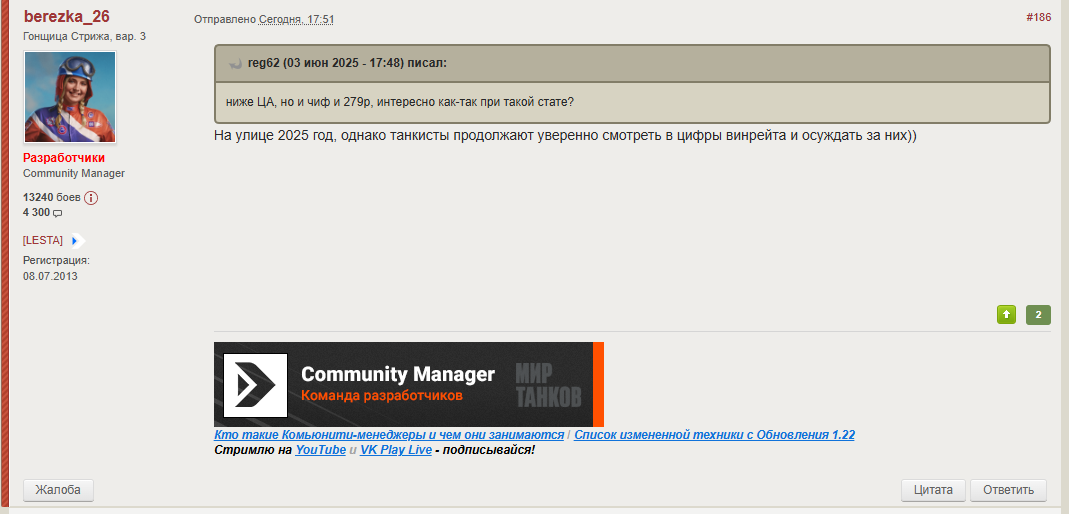 Ironthorn Опубликовано: 3 июня, 2025 Игроки 2 578 публикаций 3 529 боёв Поделиться Опубликовано: 3 июня, 2025 03 июн 2025 - 14:58 пользователь Viasat83 сказал: а ведь они свято уверенны, что тащат катки как не все себя. Жаль что реальность оказалась прозаичнее.Вон сверху лысый из браззерс уверовал.если с таким во взвод пойти (собственно, они для этого и зазывают), скажут, что ты виноват, что не помог, что вообще ничего не смыслишь в командной игре, и что из-за таких, как ты, его статка, как и любого "рукастого" танкиста произвольной команды и проседает. Скрытый текст Меркель, Барбара, командир Panzerkampfwagen VI (P) (Tiger (P)), член повстанческого сопротивления, была обнаружена, как единственно уцелевшая из экипажа на месте драмы гибели ее товарищей ввиду повреждения боевой машины по ошибке выпущеным снарядом КВ-2, как заблуждения в принятии одной из группы противников, успешно ликвидированной вышеуказанным танком с экипажем под руководством к тому моменту ст. сержанта. На основании следов повреджения с типам поражающих снарядов и анализа фактов подобных "загадочных" случаев ликвидации противника, а также отказа гражданки верхней Померании Меркель по мемориальным причинам продолжать деятельность на знакомых ей трофейных образцах техники, была зачислена внештантым офицером в экипаж в качестве командира советской боевой машины, тип и модель которой сохранены в секретности, получила приписной лист на имя Варвары и позывной "Барс", в целях избежания домыслов и негативных внутривойсковых настроений. (Из отчета от 12 апреля, политрука Павирюшкина А.Г.) Ссылка на комментарий
