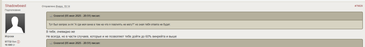 Shadowbeast Опубликовано: 6 июля, 2025 Игроки 17 911 публикация 100 746 боёв Поделиться Опубликовано: 6 июля, 2025 06 июл 2025 - 16:49 пользователь Gvasrod сказал:Понятия не имею.https://forum-mt-prod.lesta.ru/monthly_07_2025/post-962088-0-29222600-1751802017_thumb.pngВот у него спрашивай, это он что-то про 60% написал.Да.Хп это боевой ресурс, который дан что бы его тратить, а не бояться под себя в кустах на петушиной точке у респа. Да, хп потеряно, но удержана ключевая в данный момент точка благодаря которой можно было победить. Да-да, бабаха не вкатила когда он кормой стоял, но обязательно вкатит после стбата. А то что из города эту бабаху развалят за секунды это мы не учитываем.ПонятноПродаться за пачку сухариков это тот путь, который нуженНафиг победы или что-то еще, главное продаться за пачку сухариков Ссылка на комментарий