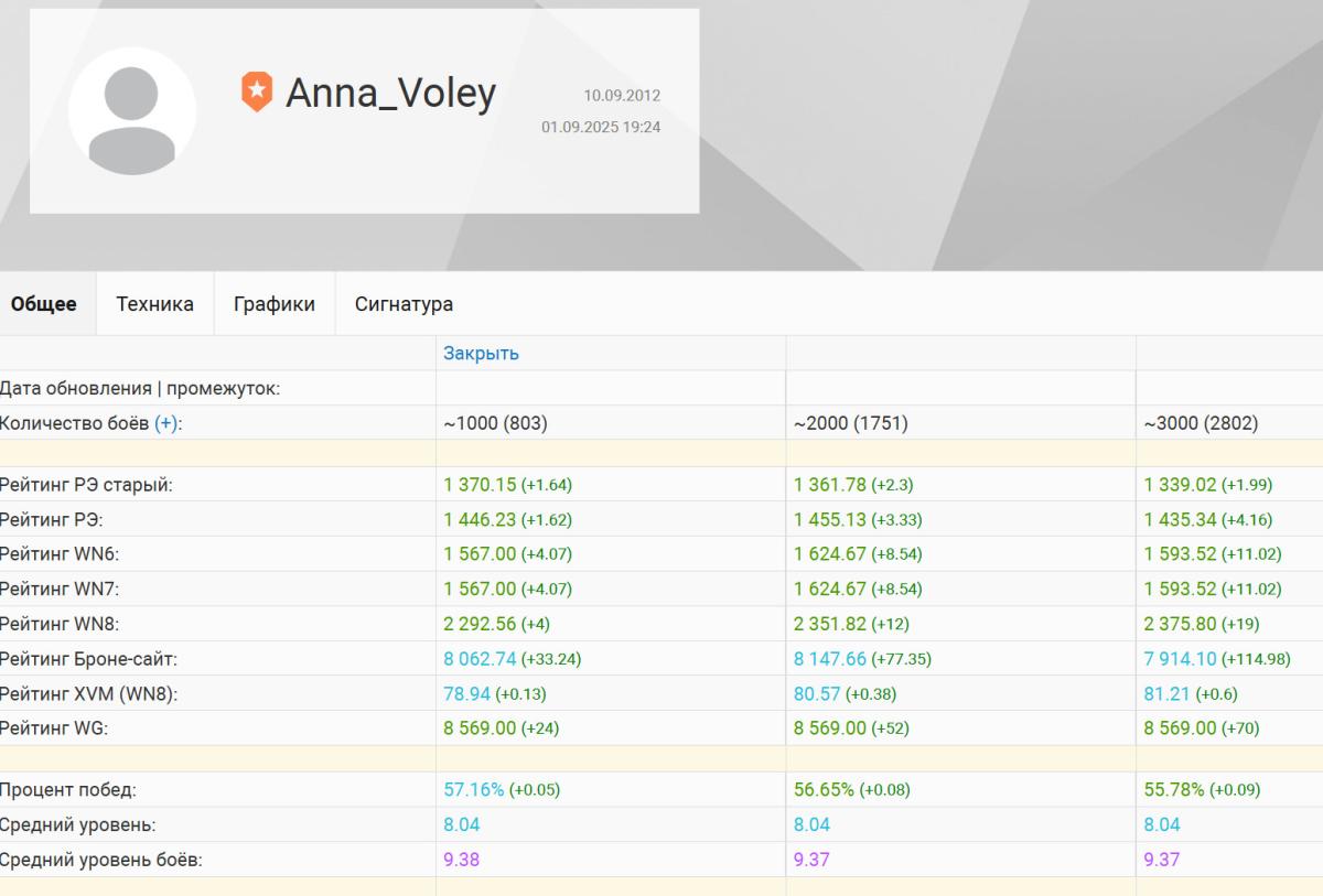 DeletedUser Опубликовано: 2 сентября, 2025 Игроки 0 публикаций 62 348 боёв Поделиться Опубликовано: 2 сентября, 2025 02 сен 2025 - 12:11 пользователь Anna_Voley сказал:неточность слов от мысли, сори) Стабильные 55%+, на абсолютно любой технике, в абсолютно любом рандоме и не только(чтоб не было влияния акций/пятниц и прочего).....ну надеюсь эта формулировка ответа более точна)А это, просто игра на двух-трёх танках относитнльно сильных....по этому такие цифры. У меня на конине около 43% что-ли, хотя танк до сих пор силён зараза) На тему подкруток, да верно) у людей нет чёткого понимания что это вообще такое, это самая простейщая форма переложить "ответственность" на другой фактор/ы, чтоб быть в белом.....старо как мир) Наверное, придется очень много и регулярно играть. Да и насчет любой техники... Вот штурмтигра взять. Уж слишком он рандомным танком кажется: залетит пробитие на 500м в аркадном прицеле или не залетит... Ссылка на комментарий