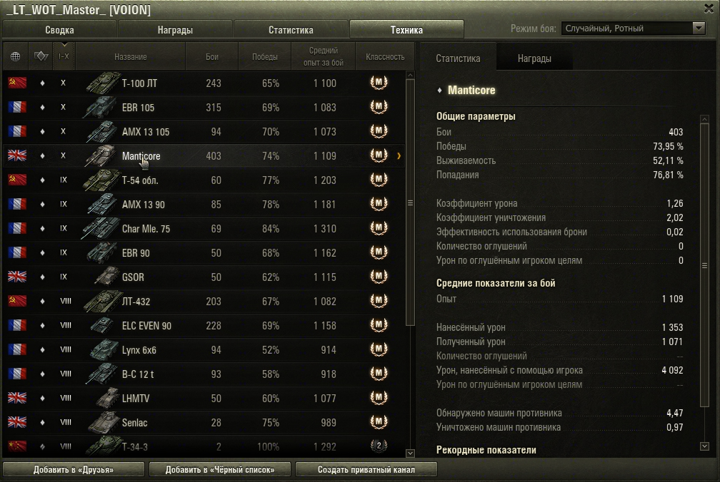 А вот например результаты статистики на почти 900 боев. Стандартные 85%, те что на т100 есть 95% отметки. Периодически бывает под 90%.