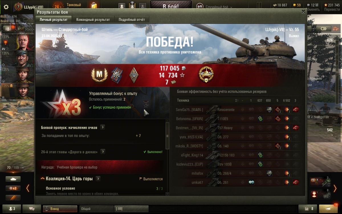 Кажется, это остался последний танк, который можно взять для ближайшего Натиска. Немного осталось. Надо бы несколько сессий на 9 скатать. :D А то скоро ВГ сам всё за меня прокачает. Я давно потерял суть прокачки в плане вникания в танки. Не успеваю отыграть хотя бы десяток+++ боев -- и конец. На 9 чуть подольше, но тоже мимо, особенно зная, что за x5 и так далеко за 10к дадут просто за ололо. В общем, будем разбираться потом, главное пока просто, чтобы был)