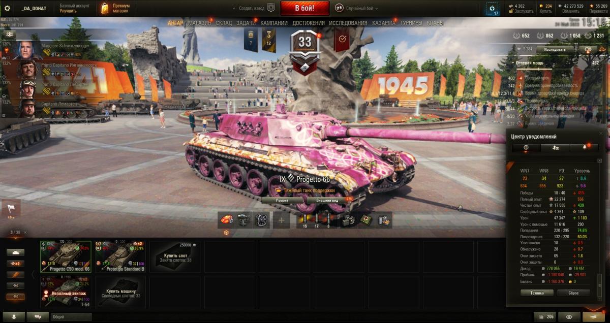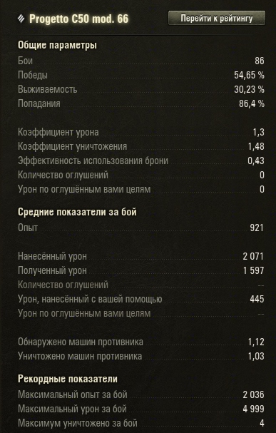 Урррааа, танк пройден и продан, теперь в ангаре Рино, Господи спасибо тебе!!! Боёв на нем 235, процент побед 43,4%, выживаемость 16,6%, Точность стрельбы 83,08%, Средний урон 1376, Максимальный 4743, Максимальный опыт 1859 - этого хватило на 1-ую степень. Последний пост в этой теме, краткое резюме: танк КАКТУС!!! Почему - брони нет, да во лбу есть что-то похожее на броню, но борт и карма сплошной картон, стоишь в позиционке, пытаешься танковать, а тебя арта каждым выстрелом  "любит и любит". Помню была такая песня "Вечно молодой" группы Смысловые галлюцинации, так вот играя на проге66 я вспоминал слова этой песни, только пел: "Вечно оглушенный".  Отсутствие динамики не позволяет тебе уехать из-под арты, 12 Км. заднего хода - это что такое!!??? Плюс, если прогадал с направлением и союзники тебя не поддержали - ты умер. Косая пушка, стрельба на дальние дистанции - лотерея, ближняя дистанция - если враг не *** начнёт тебя кружить, КД между выстрелами тоже внушительное. Даже банально ты не успеваешь въехать на холм, дать шот по только что отстрелявшемуся танку, враг откатывается быстрее, чем ты выкатываешься. Ещё и УВН -9 вниз, вообще издевательство. Танк может нормально играть в верху списка, на рельефных картах и без арты. Моё скромное и никого не интересующее мнение: машина нуждается в АПе. Либо орудий, обеих, на точность, что бы в позиционке можно было реализовывать весь потенциал магазина дозаряжания, либо в динамике, что бы невилировать отсутствие оброни.