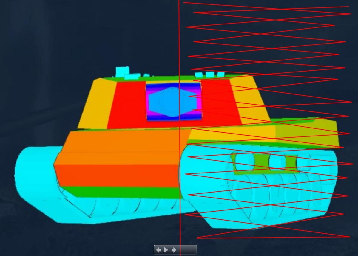 Вот смысл. Весь лоб кроме крыши и днища 290+ приведенки. Борт и каток за углом. Если еще чуть перекрутить, то будет 300+. Удачи попасть и пробить, с учетом, что вы в него кидаете по 400 раз в 6 сек.