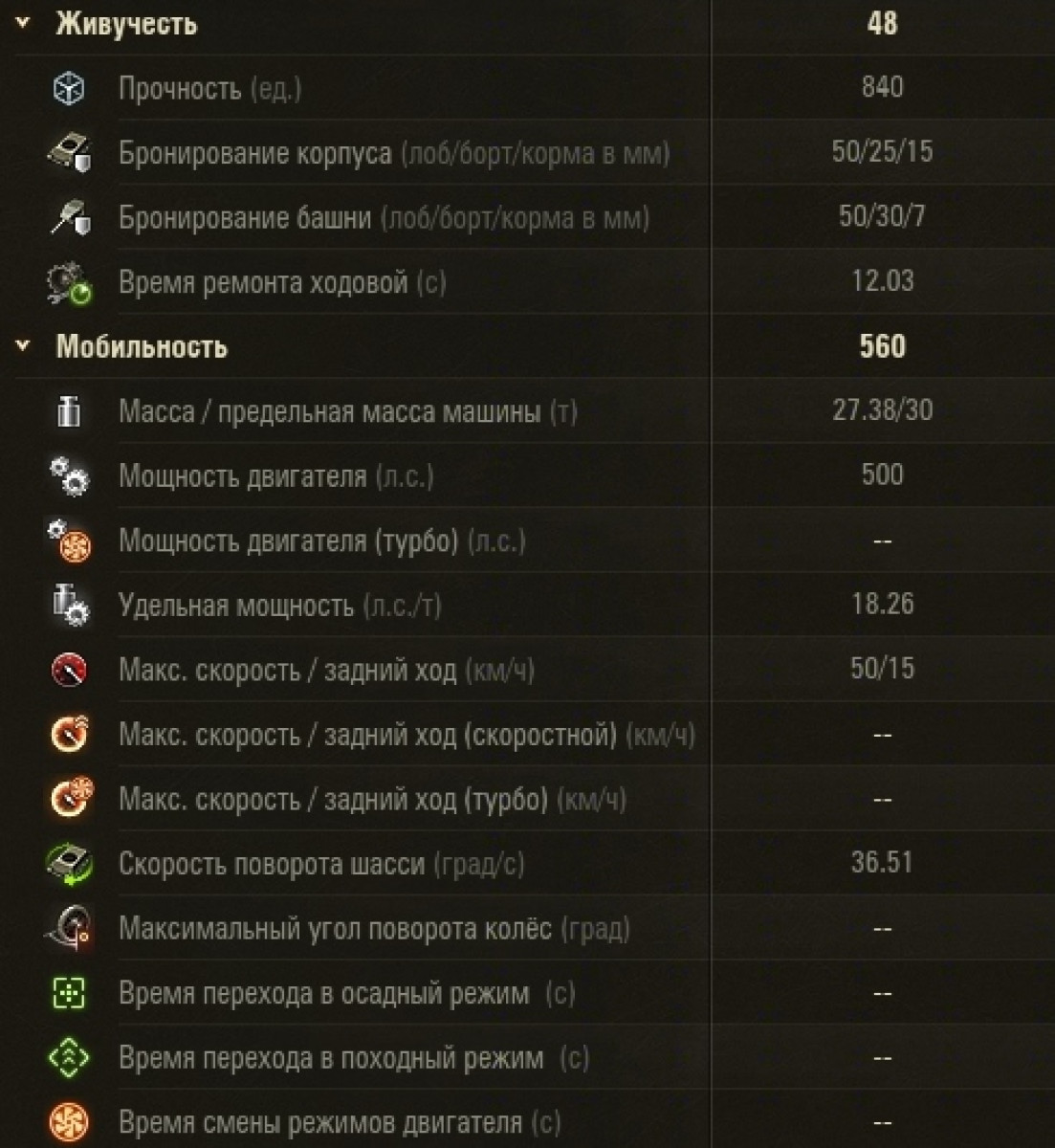 Топовая ходовая обладает средней скоростью поворота – 35 градусов в секунду. Благодаря наличию башни, пусть и неполного поворота, нас сложно закрутить, особенно если есть возможность упереться кормой в дом или камень.