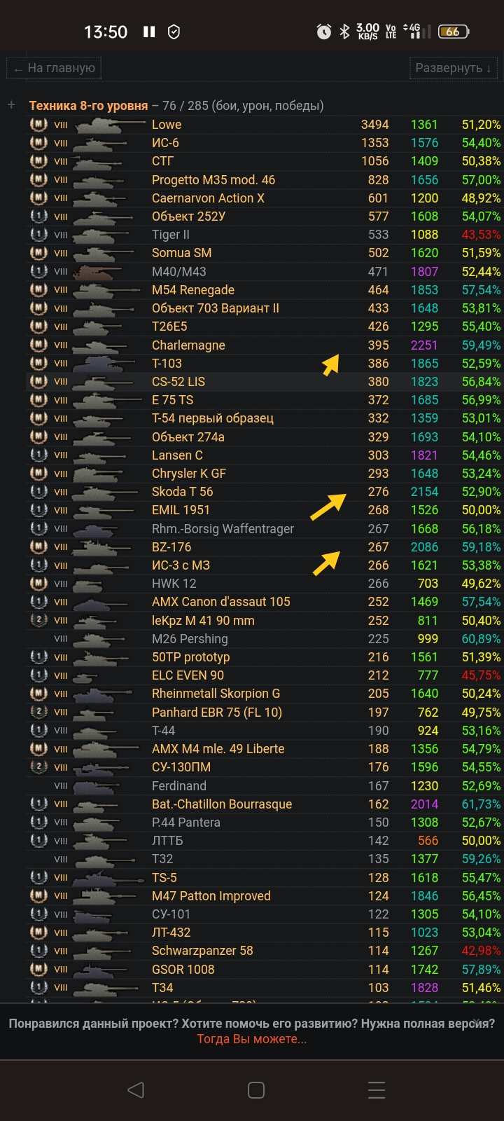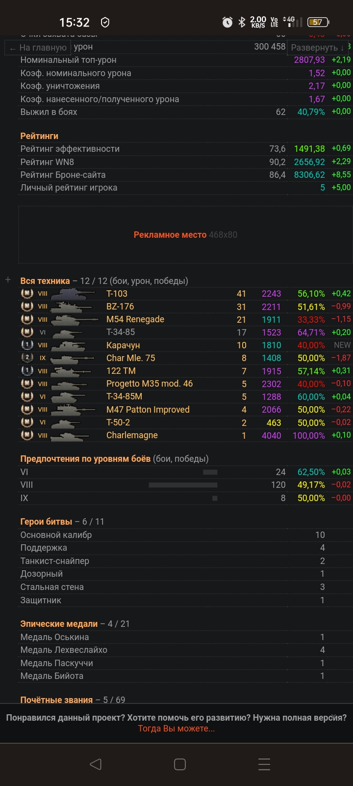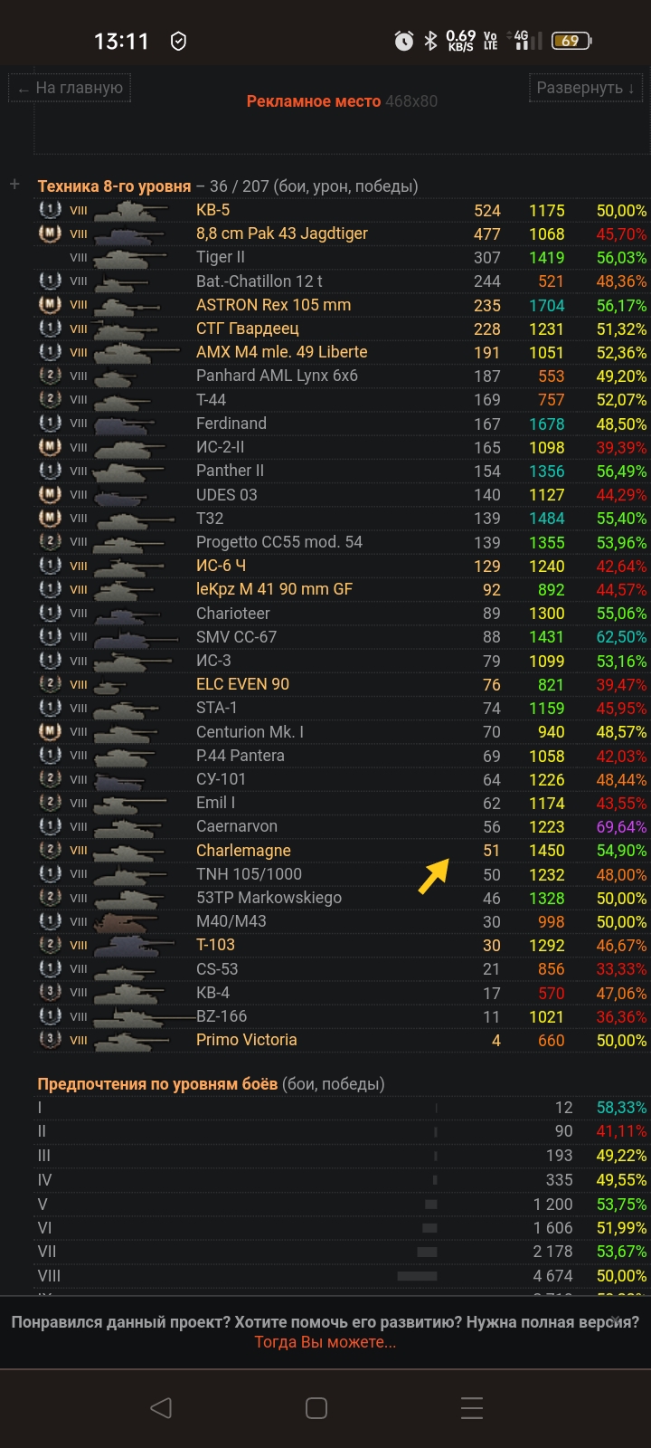 Выводы о средухе за мои 51 боёв на Шарлемане делаем? Это по-твоему адекватно? А что же ты у меня не смотришь, например Астрон Рэкса, который тоже 8-ка, только ст и 1700 среднего у меня имеет за 235 боёв. Имба, получается? Да нет, просто нормальный танк и мне понравился его геймплей, отсюда и результаты при игре в удовольствие.